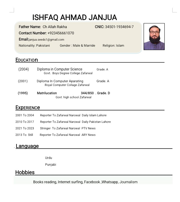 Ishfaq Ahmad Janjua is son of Allah Rakha Janjua livingin Zafarwal Tehsil, District Narowal since his birth 1977. He received his early education from Government Primary School, Mandi Wala, Zafarwal, and completed my matriculation from Government High School, Zafarwal. He is also computer literate he completed a computer course from Government Boys Degree College, Zafarwal.